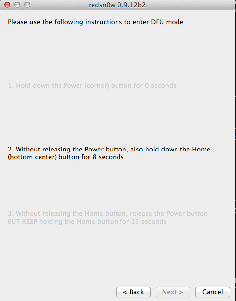 Сейчас мой iPod подсоединен к устройству, но не выключен. Я выключаю iPod, как того требует redsn0w. Как только iPod выключен, становится активна кнопка Next. Кликните на кнопку Next, после чего redsn0w попросит вас перевести устройство в режим DFU.