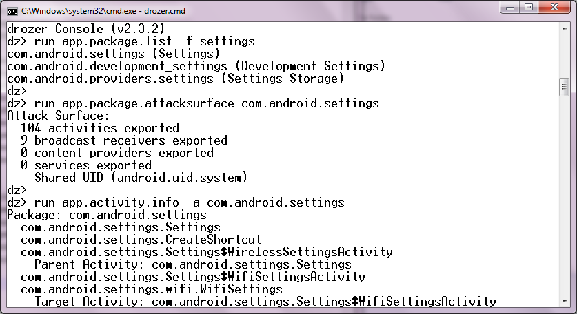 Фреймворк Drozer предоставляет продвинутые возможности для взаимодействия с Android-приложениями и их компонентами. После установки Drozer-агента на целевом Android-устройстве, которое будет функционировать как вредоносное приложение, становится возможным установить связь между консолью и агентом Drozer. Из консоли можно получить список всех пакетов, связанных со словом «setting», для того, чтобы попытаться опознать приложение Settings («com.android.settings»):
