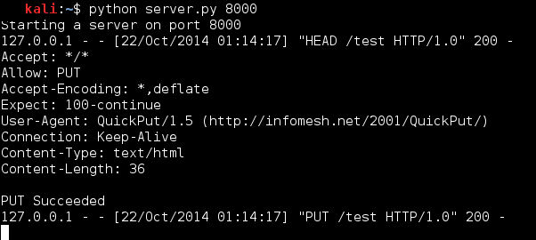 Для тестирования некоторых описанных выше техник я попытался установить сервер Apache, но возникли некоторые сложности с настройкой разрешения PUT-запросов. Затем я нашел и модифицировал пару python-скриптов и по-быстрому установил тестовый веб сервер. Ниже показан пример работы со скриптом Quickput.py, о котором я рассказывал ранее.