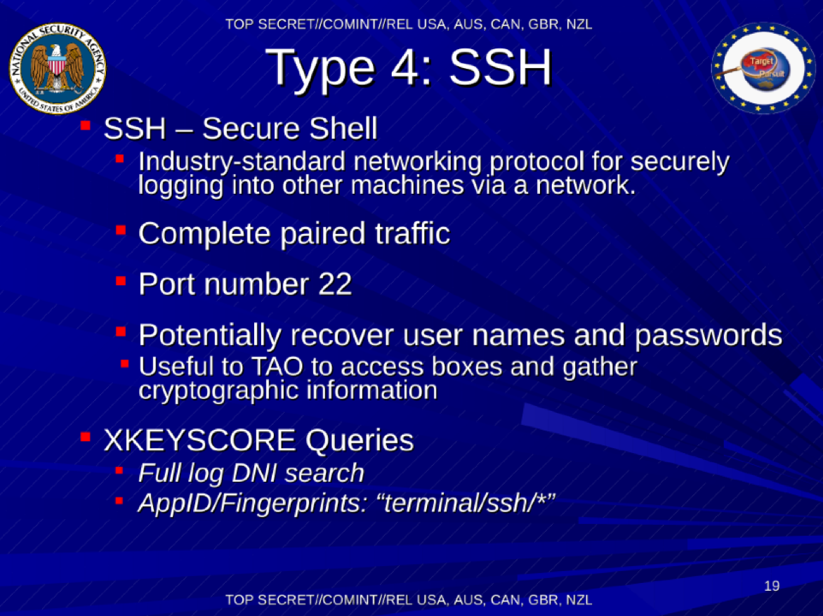 Якоб Аппельбаум, исследователь и один из основных документалистов Эдварда Сноудена, заявил о существовании у АНБ методов расшифровки трафика PPTP, IPSEC, SSL, SSH. Среди приоритетных целей для взлома в документах американской спецслужбы отмечены Zoho, анонимная сеть Tor, приложение для шифрования файлов Truecrypt и российский сервис Mail.Ru.