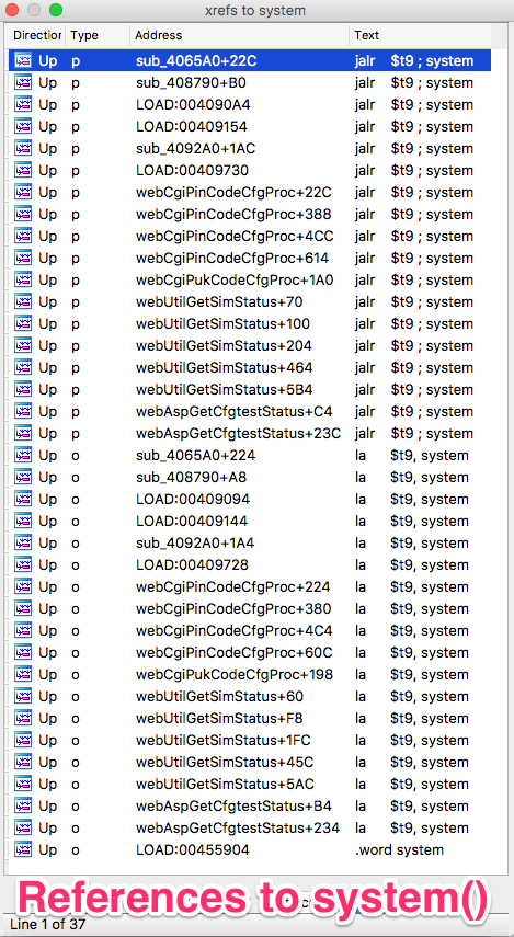 Поиск ссылок на функцию system – эффективный способ поиска «намеков» на уязвимости, связанные с инжектированием команд. Далее мы смотрим детально каждый вызов, где используется нефильтрованные входные данные. На рисунке ниже показаны все ссылки на функцию system() в бинарном файле /bin/web: