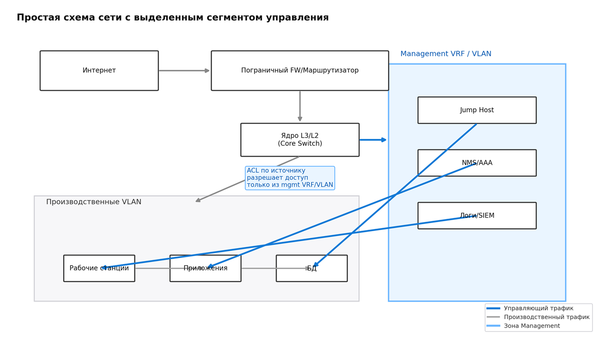 Базовая политика звучит просто. Только SSH для командной строки и только HTTPS для веб. Никакого Telnet и открытого HTTP. Управление допускается из отдельного сегмента. Если устройство поддерживает выделенный порт или виртуальный контекст для управления, используем его. Тогда служебный трафик не пересекается с пользовательским.