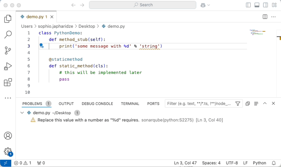 SonarLint представляет собой бесплатное расширение с открытым исходным кодом, предназначенное для интеграции в популярные среды разработки, такие как Visual Studio Code, IntelliJ IDEA и Eclipse. Его ключевая задача — помощь разработчику в обнаружении и исправлении дефектов непосредственно в процессе написания программного кода. Инструмент в реальном времени анализирует код, идентифицируя широкий спектр проблем: от стилистических погрешностей и дублирующихся фрагментов до отклонений от установленных правил кодирования. Эти недостатки снижают читаемость, ясность и сопровождаемость кода. Для оперативного реагирования SonarLint информирует разработчика о найденных проблемах, часто предоставляя конкретные рекомендации по их устранению. Найденные инциденты визуально выделяются непосредственно в редакторе и отображаются в специальной панели PROBLEMS.