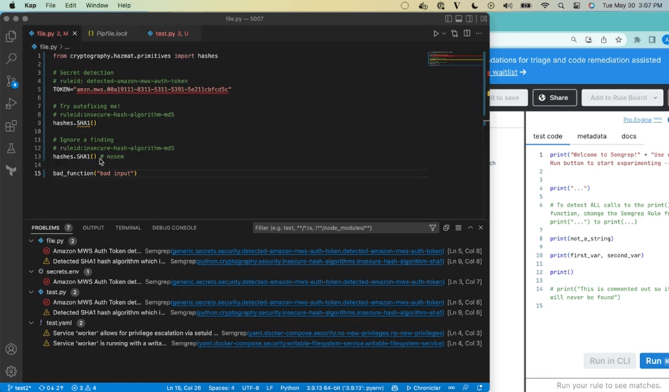 Semgrep — это плагин для интегрированных сред разработки (IDE), поддерживающий Visual Studio Code и IntelliJ IDEA. Он предназначен для выявления потенциальных ошибок, уязвимостей и контроля соблюдения стандартов кодирования непосредственно в процессе написания программного кода. Semgrep способен интегрироваться в процесс контроля версий в качестве pre-commit hook. Это означает, что сканирование кода выполняется автоматически перед каждой фиксацией изменений в репозитории. Такой подход позволяет разработчикам оперативно устранять дефекты, эффективно предотвращая попадание проблемного кода в рабочую среду.