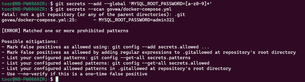 Git-secrets также работает как pre-commit hook: запускается, проверяет файлы на наличие секретов и, если таковые обнаружены, блокирует коммит.