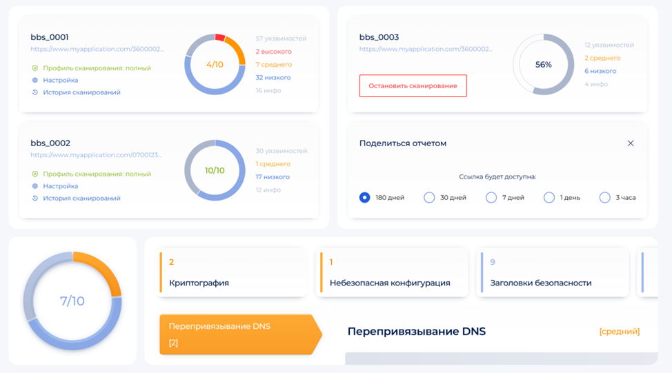 Результаты сканирования представляются в формате детализированных отчетов и статистических данных, которые визуализируются на дашбордах. Доступна также фильтрация уязвимостей по уровню опасности. Каждая брешь сопровождается подробным описанием с указанием возможных сценариев эксплуатации, а также рекомендациями по устранению недостатка.