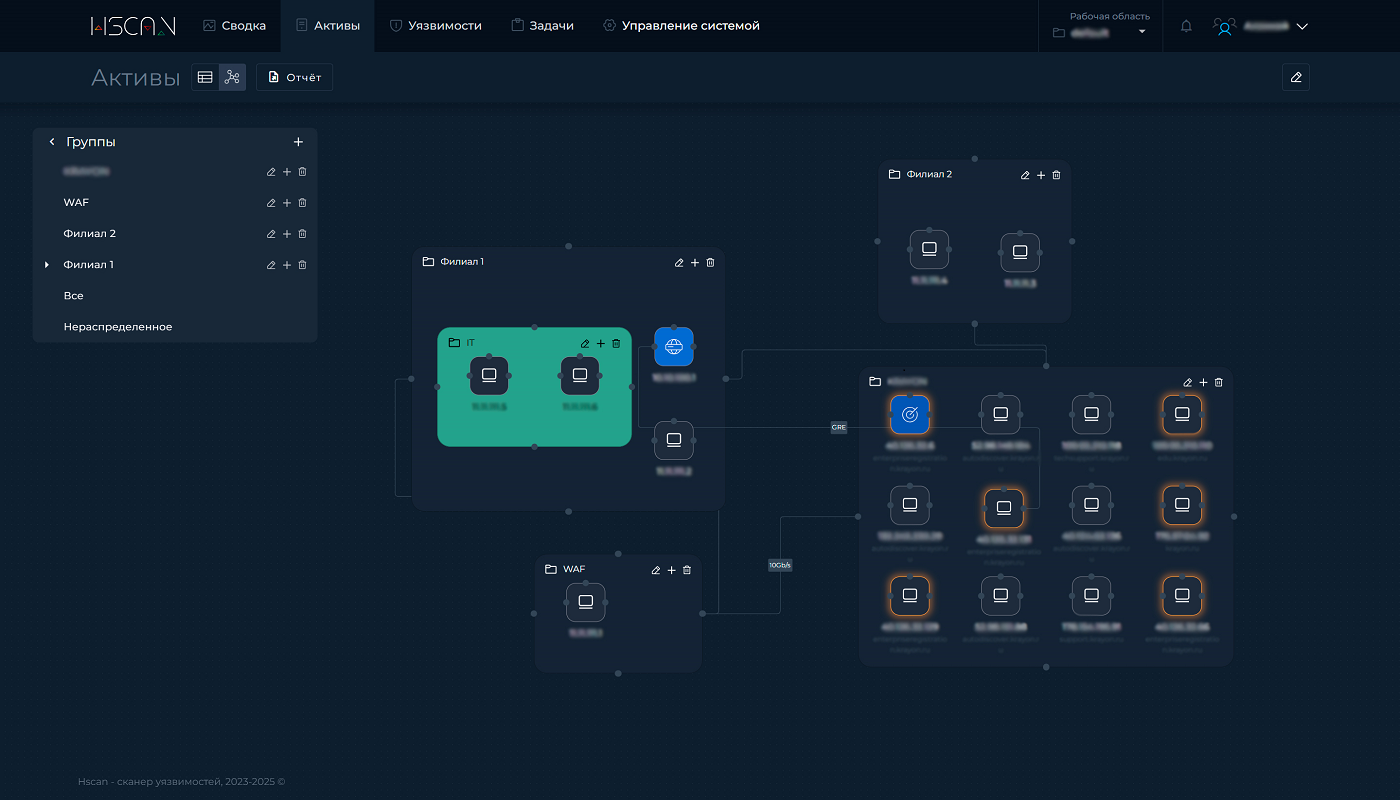 Система довольно точно определяет все активы в организации, и способная найти то, о чём отдел ИТ или ИБ в компании могли забыть, например, тестовый сервер со старого проекта. Такие забытые активы часто становятся точками входа для атаки. Топология визуализируется в виде графа. Узлы — активы, рёбра — связи. Можно отмечать зависимые сервисы, их критичность для бизнес‑процессов, группировать активы по специфическим для инфраструктуры компании признакам и т.д. Из карты удобно запускать задачи на сканирование по группам или отдельным активам, а карточка актива ведёт к истории проверок и связанным задачам. Это экономит время аналитика и ускоряет планирование работ.