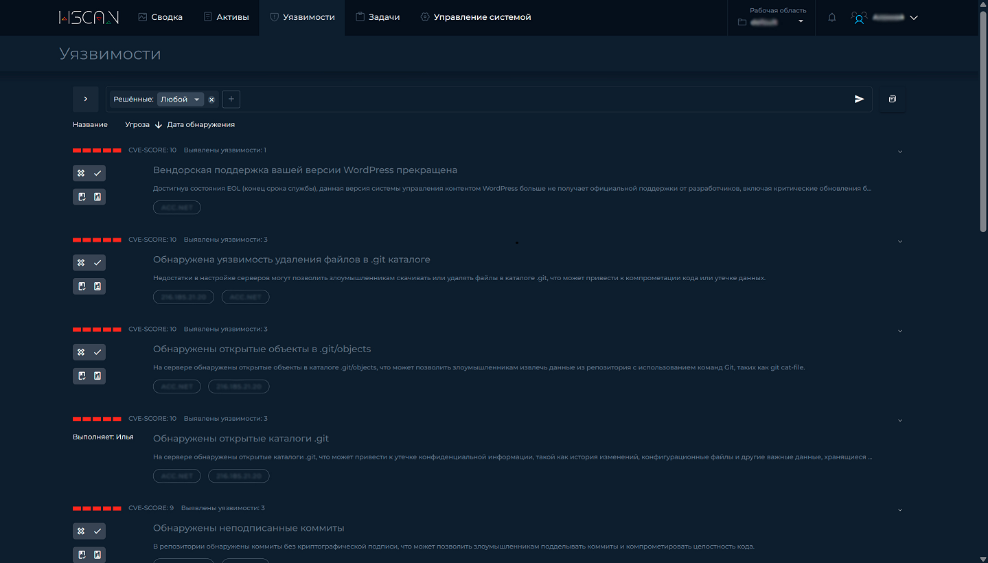Также внутри HScan реализовано обязательное заполнение отчёта исполнителем по завершении задачи, включая: принятые меры (патч, конфигурация, компенсирующий контроль), доказательства исправления (скриншоты, ссылки на тикеты), статус верификации.