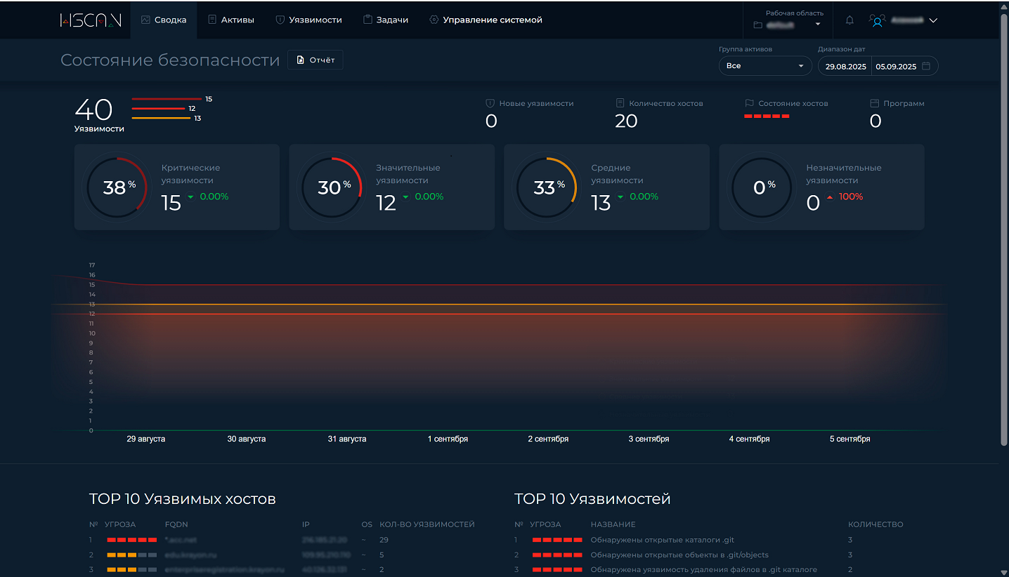 Раздел сводка – это общий дашборд по уязвимостям сетевого периметра, где собраны ключевые показатели текущего состояния защищенности инфраструктуры. Видна динамика, распределение по уровням риска и топ уязвимых активов.