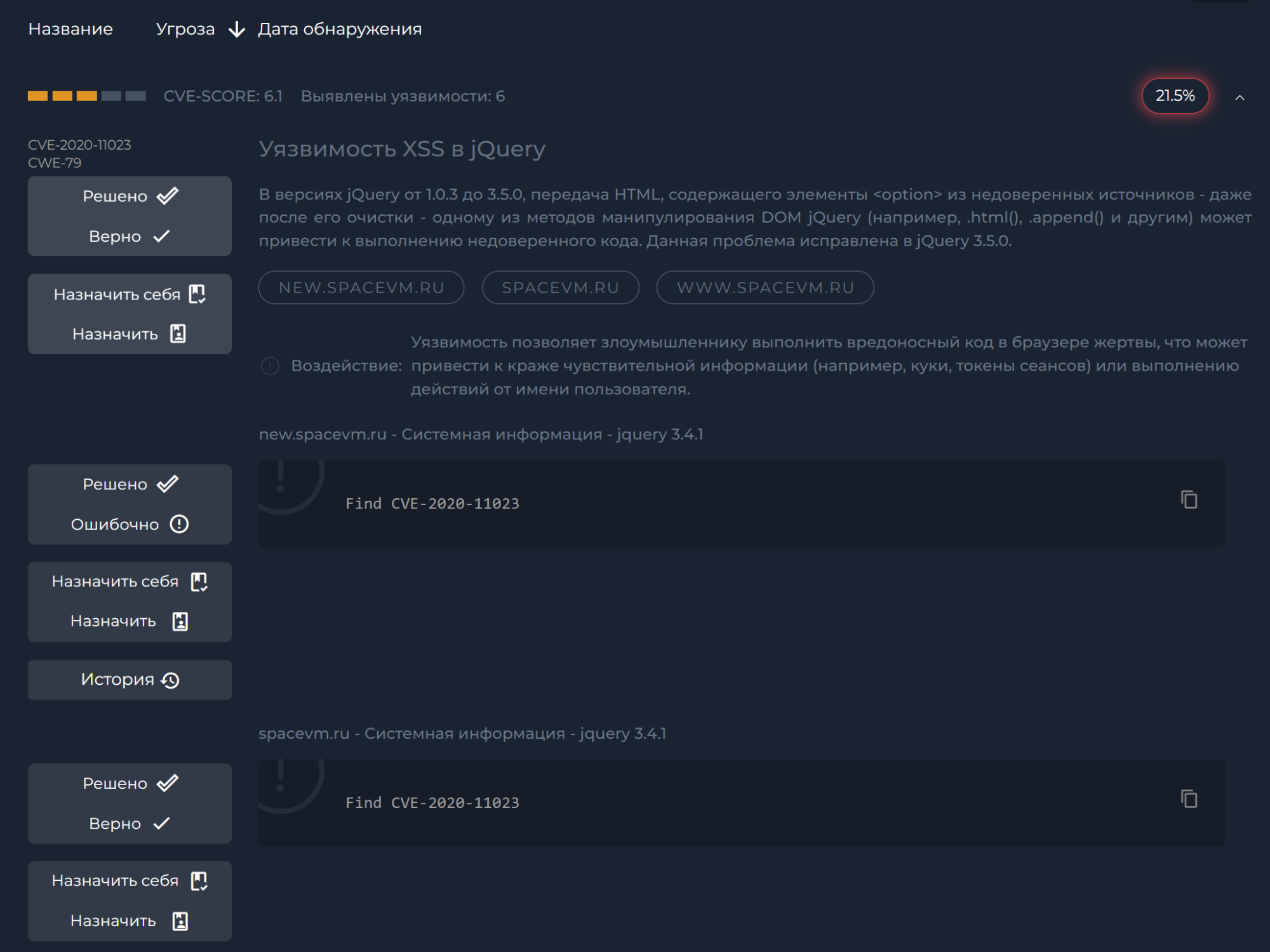 Для каждой уязвимости доступны подробное описание, технические детали, возможные сценарии эксплуатации, информация об ответственном за устранение сотруднике (либо возможность его назначить), а также подробный лог действий. При необходимости отчёт можно выгрузить в HTML и CSV.