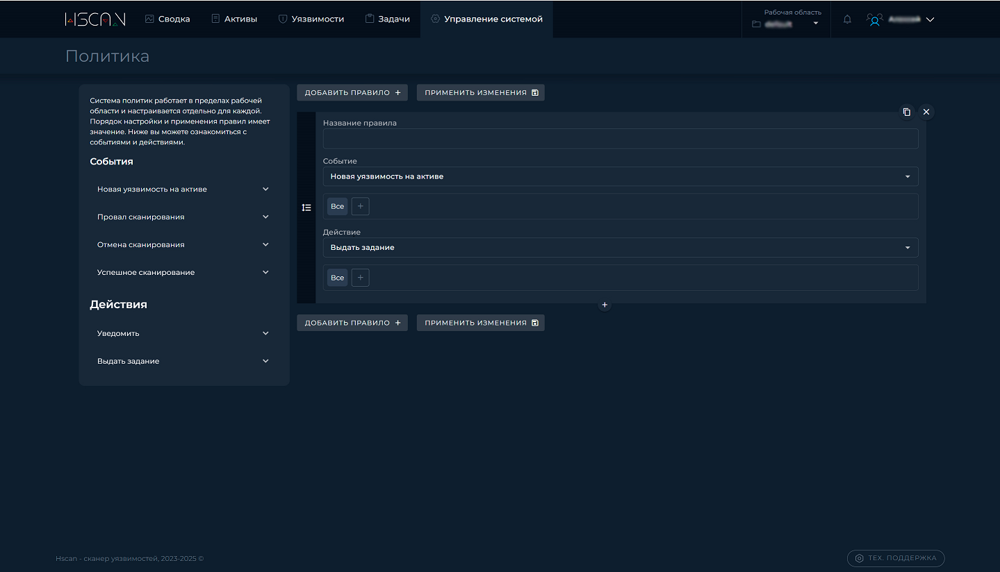 Зрелый процесс невозможен без автоматизации. В HScan возможно настроить политики, то есть автоматизировать реакции на определенные триггеры событий в системе.