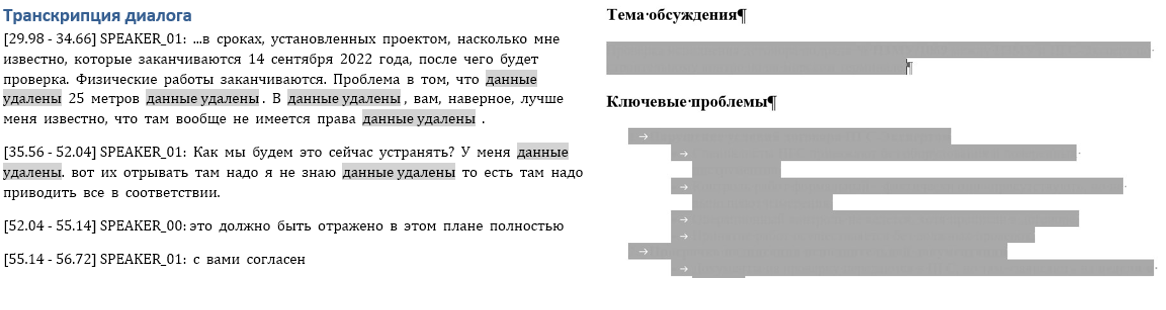 В итоге разработали инструмент на базе другой модели — Whisper AI, который транскрибирует аудиозаписи. Распознавание часового совещания занимает 10-15 минут. Затем текст загружается в языковую модель, которая формирует структурированный протокол с ключевыми тезисами и решениями. Финальная проверка документа занимает минимум времени. Вся система работает локально.