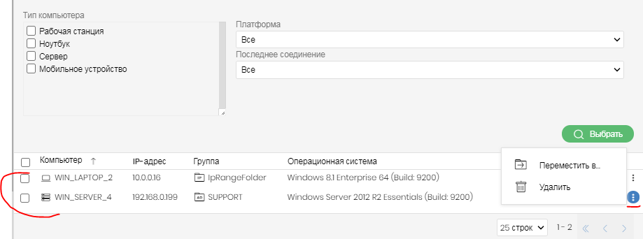 Данный фильтр полезен для быстрого поиска требуемых компьютеров из большого списка для выполнения последующих операций (перемещение, удаление, проверка, планирование задачи и пр.).