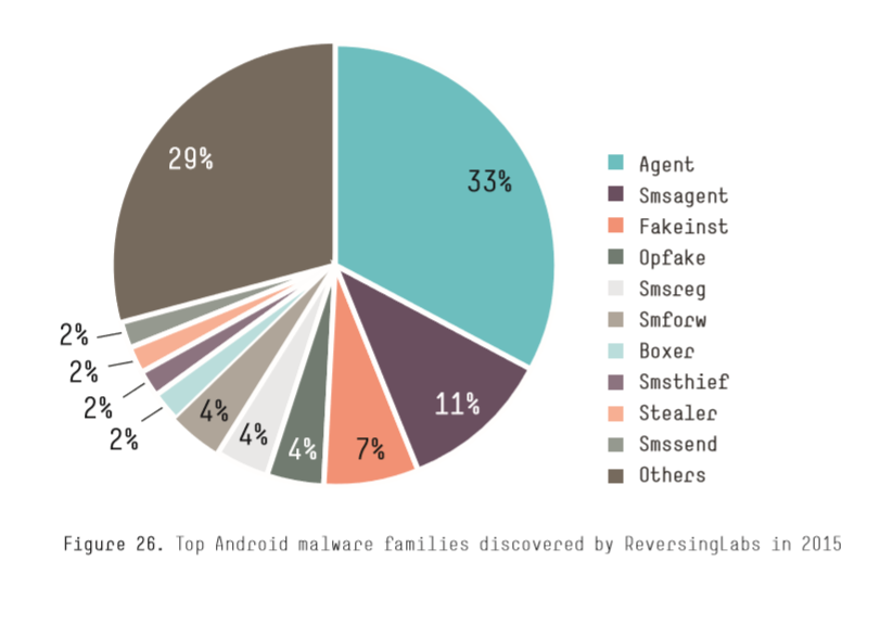 В 2015 году наиболее распространенными семействами вирусов для Android были Agent (33%), Smsagent (11%) и Fakeinst (7%).