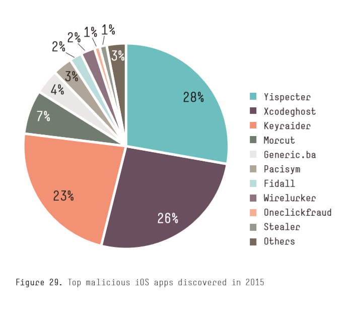 А первая тройка вирусов под Apple iOS – Yispecter (28%), Xcodeghost (26%), Keyraider (23%).