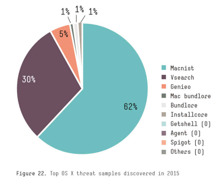 Больше половины (62%) вирусов для Apple Mac OS X относятся к семейству Macnist. Оставшийся кусок яблочного пирога разделили Vsearch (30%) и Genieo (5%).