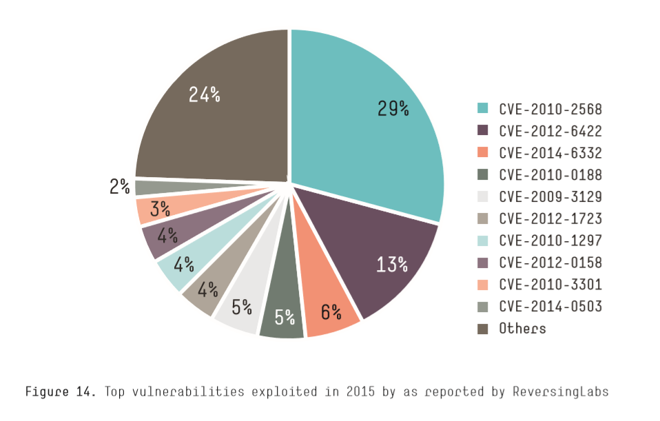 Системы детектирования компании ReversingLabs, на данные которой ссылаются в исследовании HP, выявили определенный консерватизм в поведении основной массы эксплойтов. В 2015 году в 29% случаев предпринимались попытки использовать уязвимость шестилетней давности CVE-2010-2568 я ярлыках Windows, известную по Stuxnet и пропатченную повторно в 2015. На третьем месте стоит относительно свежая бага CVE-2014-6332 (64%), которая тоже относится к Windows, что в очередной раз говорит о важности обновлений этой операционной системы.