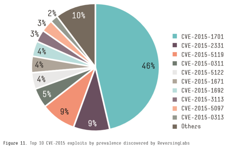 Повышение привилегий в Windows – маст хэв для эксплойтов, но в целом уязвимости Adobe Flash доминируют. Третье, четвертое и пятое места держат уязвимости CVE-2015-5119, CVE-2015-0311, CVE2015-5122 – они часто используются для проведения атак drive-by download. О двух из них стало известно после утечки Hacking Team. Десять из двадцати самых эксплуатируемых уязвимостей – это уязвимости Flash.
