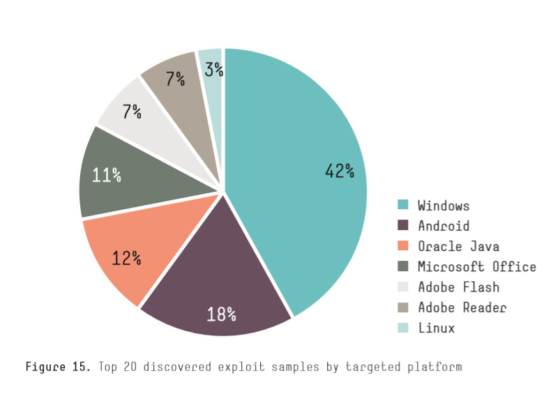 В целом Windows остаётся главной целью вредоносного ПО (42%), но 18% атак приходится уже на Android. В прошлом году второе место с 21% занимали уязвимости Java.