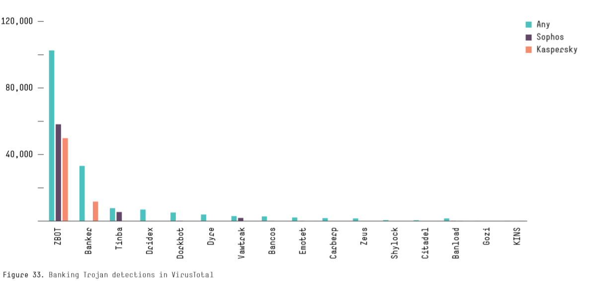 Среди банковских троянов лидирует созданный в 2007 году ZBot (ZeuS). Втрое место у Banker, третье у Tinba, четвертое у Dridex.