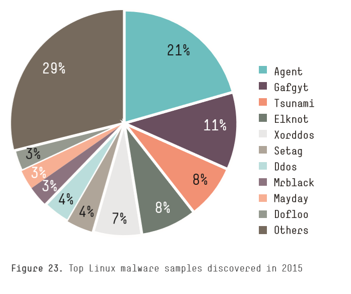 В 2014 году компьютеры на Linux атаковал Darlloz. От него досталось также роутерам и ресиверам цифрового телевидения. Сегодня вероятнее всего встретиться с вирусами Agent (21%), Gafgyt (11%) и Tsunami (8%).