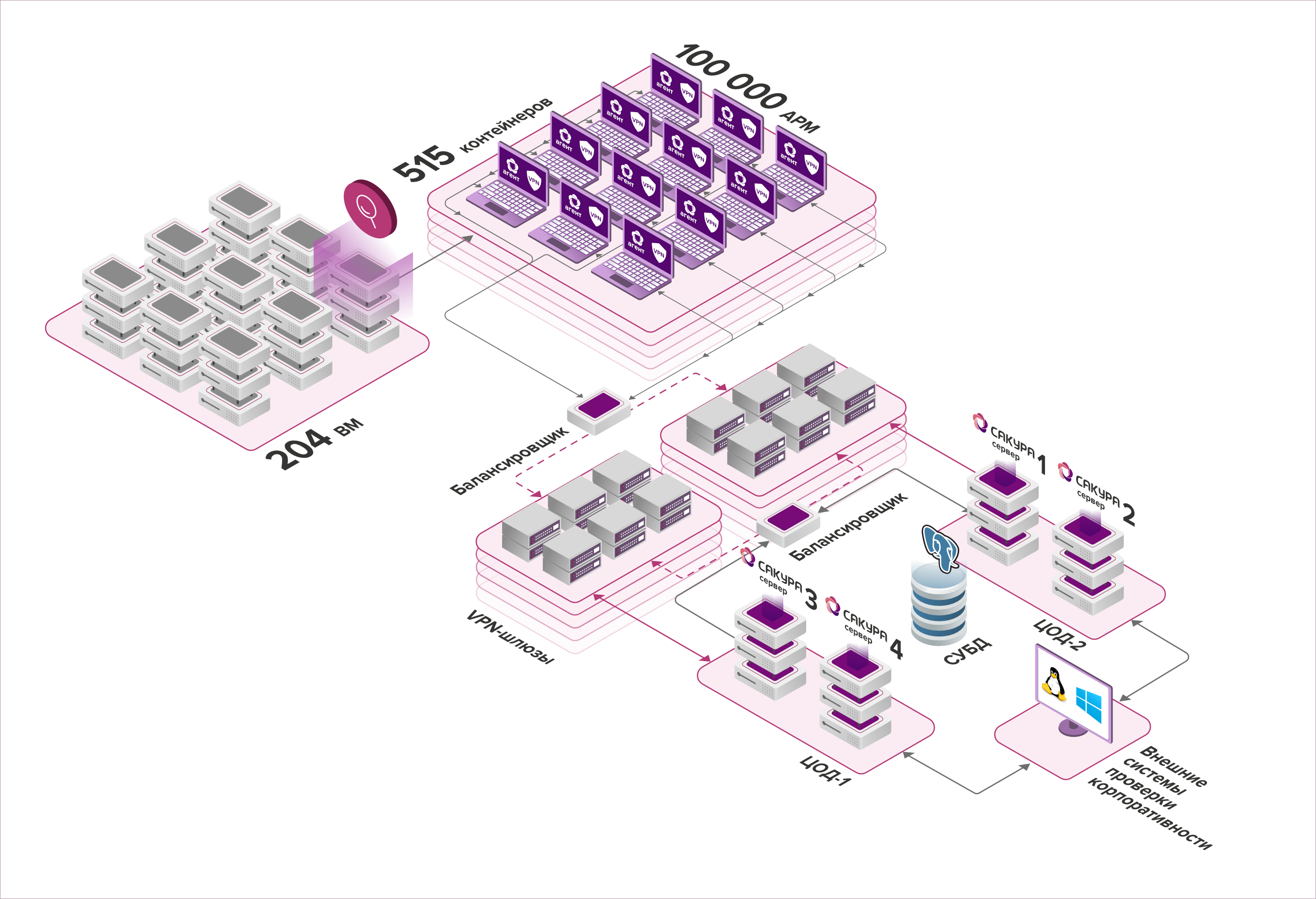 - Эмуляция клиентской части – 204 виртуальные машины, в каждой 515 контейнеров с агентом САКУРА и VPN‑клиентом, дистанционно подключающихся к Информационному контуру