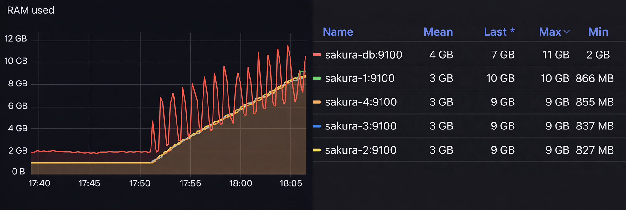 - Пиковое потребление памяти (RAM) на серверной части инфраструктуры не превышало 12 Gb.
