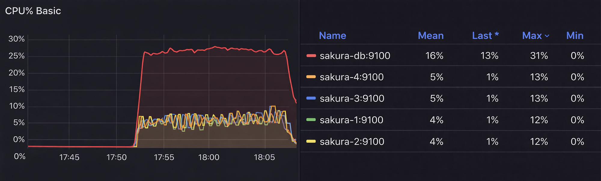 - Нагрузка на процессор (CPU) у серверов САКУРА составила не выше 15%, а у сервера СУБД не выше 30%.
