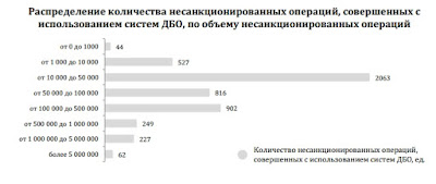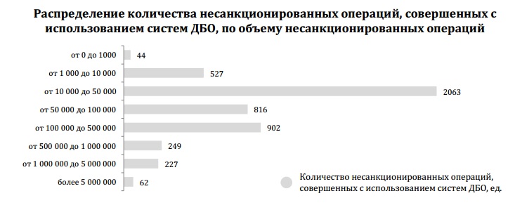 - За 2014 год в Банк России было сообщено о 4,89 тыс. случаев попыток осуществления несанкционированных операций посредством систем ДБО на общую сумму 1,64 млрд руб. Из них 825операций на сумму около 900 млн руб.были остановлены в полном объеме, в том числе по обращениям клиентов, до наступления окончательности перевода денежных средств. Более 80% (на сумму более 700 млн руб.) всех попыток осуществить несанкционированный перевод денежных средств прошли успешно, т.е. денежные средства были списаны со счета клиента полностью или частично.