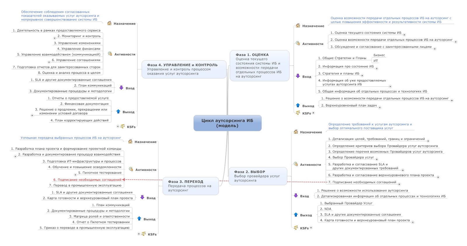 Поэтому решил сделать свою собственную модель - цикл аутсорсинга ИБ с преферансом и куртизанками. Первая редакция получилась, на мой взгляд, удачной. Привожу верхнеуровневую модель в виде майндкарты: