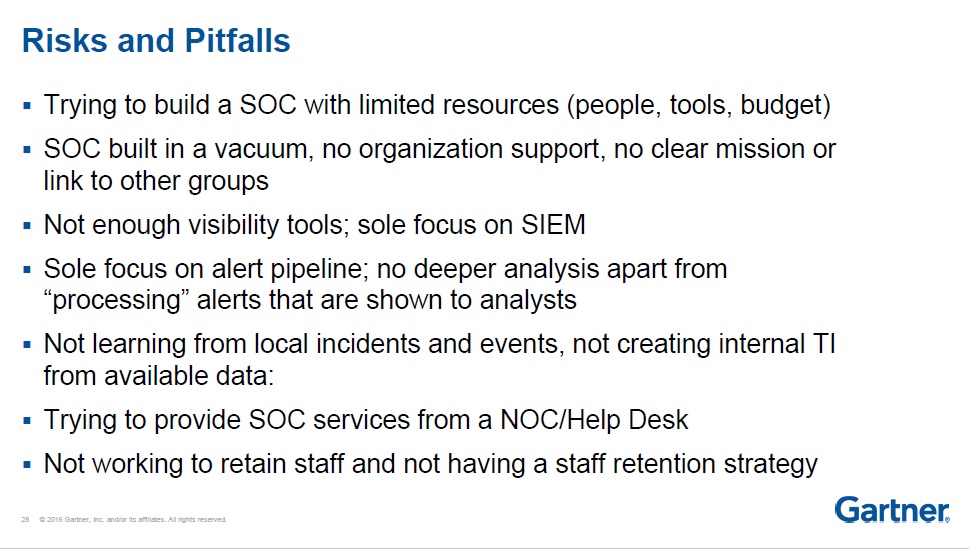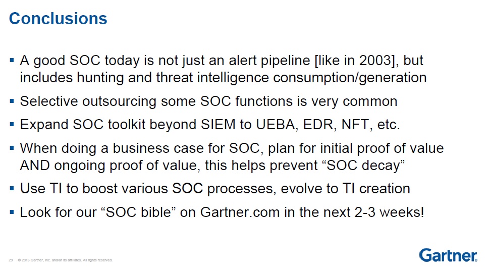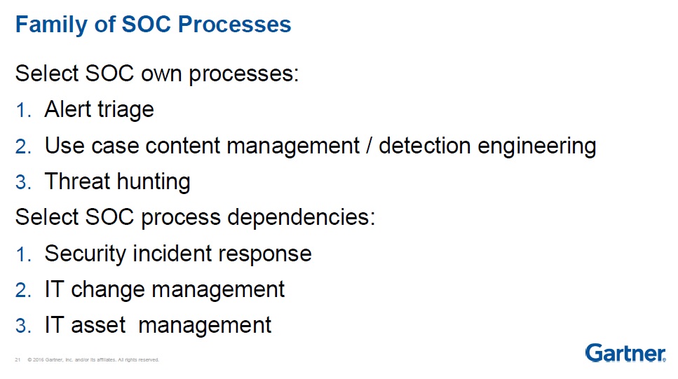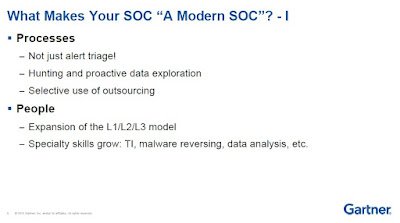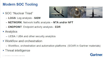 На днях посмотрел вебинар Gartner "Design a Modern Security Operation Center", на котором спикером был известный специалист Anton Chuvakin. Что удивительно для Gartner, но материалы выложены в общий доступ, посмотреть запись и скачать презентацию можно тут. Такая халява бывает редко.