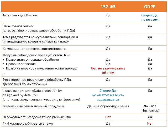 Сделал для себя небольшую таблицу-сравнение 152-ФЗ и GDPR. Вроде и шутливая, но самые важные моменты в ней представлены...