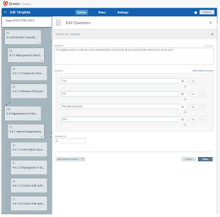 Кстати, в процессе тестирования выявилась еще одна забавная особенность существующих опросников - они слишком качественно сделаны. Поясню. В опроснике можно задавать не только варианты ответов и пустые поля (об этом ниже), но и обязывать респондентов прикреплять вложения (свидетельства аудита) и оставлять обязательные комментарии. К примеру, "молодцы" аналитики по умолчанию на 188 вопросов по ISMS 27001 при ответе "Yes" ("да, все хорошо, требование выполняем") заставляют вкладывать свидетельства аудита и без этого ответ не засчитывают... Представляете себе трудозатраты отвечающих и объем передаваемой информации? В своем шаблоне убрал эту опцию из большинства вопросов...