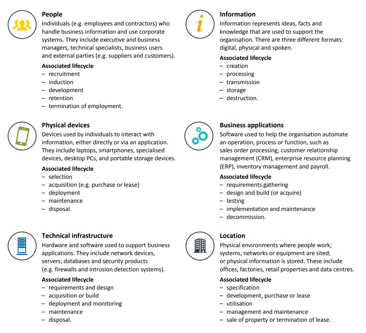 Ну. в общем, документ интересен. И помимо рекомендаций по доменам ИБ, в нем можно найти еще довольно неплохой каталог угроз (на днях гляну его повнимательнее, может расширим свой реестр рисков), рекомендации по проведению оценки влияния на бизнес (BIA) и простую, но толковую модель активов. Вот она: