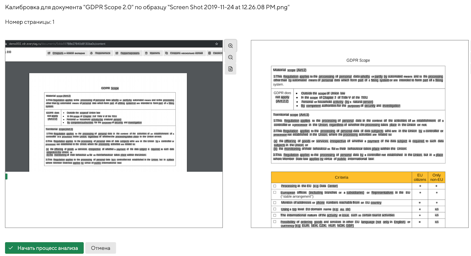 При загрузке фрагмента документа на анализ система, определив исходный (эталонный) документ, предложит сделать калибровку копии документа и исходного текста, это необходимо сделать для повышения скорости и точности разбора. Достаточно выделить несколько пар объектов и можно начинать анализ...
