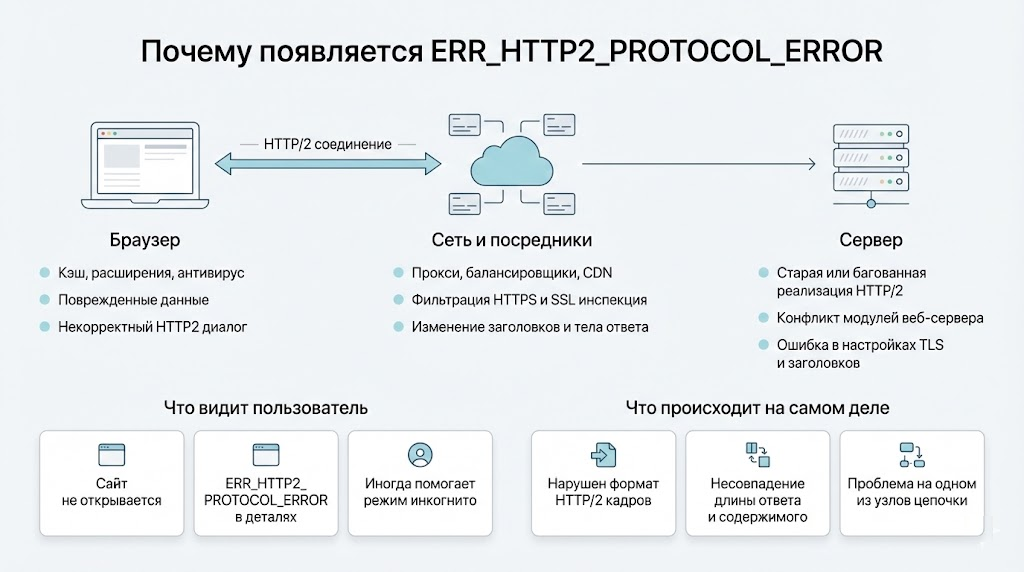 Если обобщить реальные кейсы, чаще всего причина сидит на стороне сервера или промежуточных узлов, а не у конечного пользователя. При этом браузер не знает подробностей, он видит только некорректный протокольный диалог и пишет ERR_HTTP2_PROTOCOL_ERROR. Ниже основные группы причин, которые стоит проверить в первую очередь.