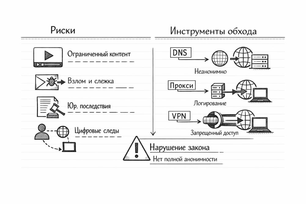 С точки зрения права DNS, прокси и VPN - не волшебные кнопки, а просто разные способы добраться до сервиса. С точки зрения практики разница огромная. Юридический риск чаще определяется контентом и целью доступа. Технический риск чаще определяется тем, кому вы доверили трафик и какие следы оставили.