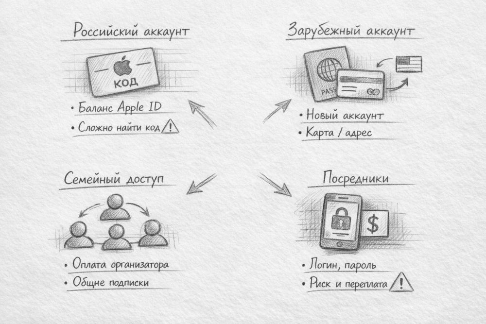 Если смотреть на вопрос трезво, жизнеспособных сценариев осталось немного. Для российского аккаунта самым спокойным вариантом остается оплата с уже существующего баланса Аккаунта Apple. Для зарубежного магазина нужен отдельный аккаунт под конкретный регион и источник оплаты именно для этого региона. Все остальное находится где-то между неудобством, переплатой и риском потерять деньги.