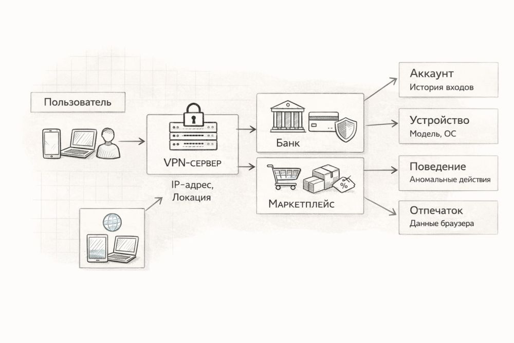 Если вы заказываете товар с доставкой домой, маркетплейс все равно узнает адрес, имя получателя и историю покупок. Если вы пользуетесь банковским приложением, банк все равно знает клиента по договору и операциям. Если вы включили VPN, а затем вошли в знакомый аккаунт с тем же устройством, сервис все равно узнает старого пользователя, просто увидит его в более рискованной сетевой среде.