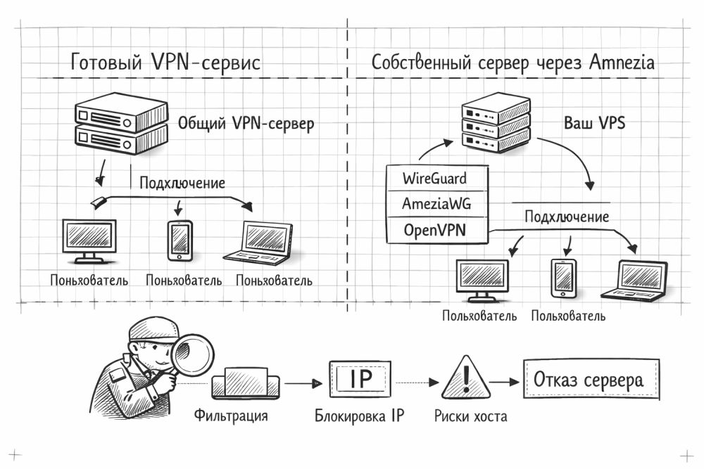 У обычного коммерческого VPN пользователь чаще всего покупает доступ к общей инфраструктуре провайдера. У Amnezia акцент другой: приложение может само развернуть VPN на вашем VPS и затем подключить к нему все нужные устройства. За счет такого подхода у пользователя меньше зависимости от общего пула IP-адресов, которые легче массово вычислять и резать.
