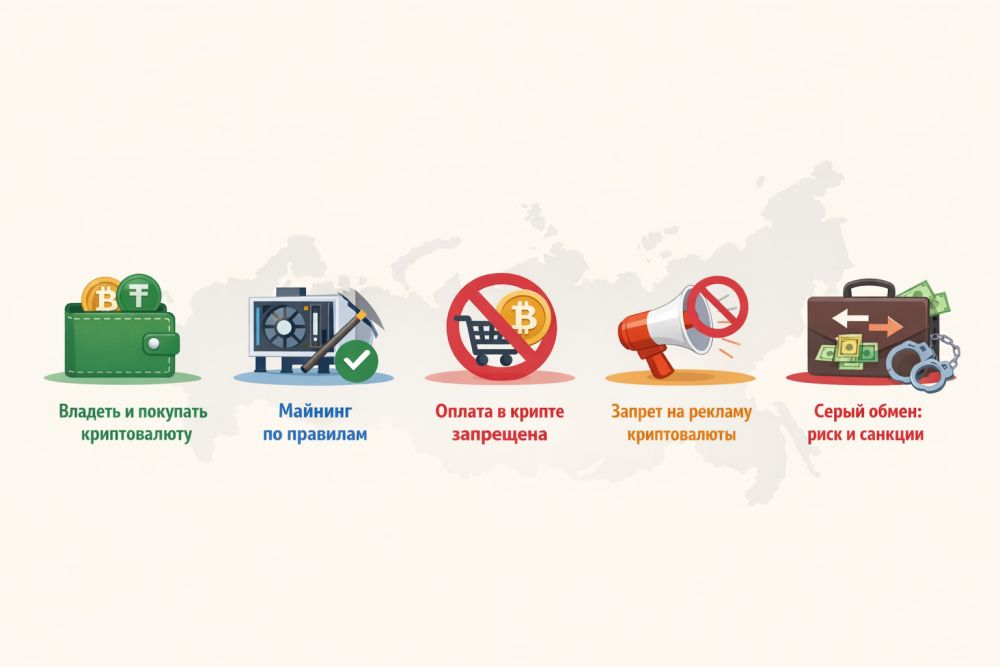 Вокруг российской крипты сейчас слишком много крика и слишком мало точности. Из новостей легко сделать ложный вывод, будто в России уже запретили вообще все, от хранения биткоина до обычной продажи на бирже. Такой вывод неверен. Cейчас простое владение криптовалютой не является ни преступлением, ни отдельным административным нарушением. Но внутренняя оплата криптовалютой в России запрещена, публичное продвижение криптовалюты для широкой аудитории тоже запрещено, майнинг поставили под жесткие правила, а государство готовит следующий этап, уже с крупными штрафами и уголовными составами.