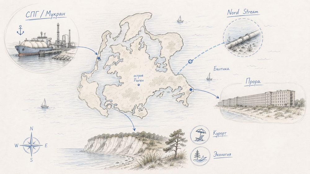 Когда в новостях всплывает Рюген, речь обычно идет не про пляжи, мел, сосны и размеренный немецкий отдых. Шум вокруг острова появился потому, что Рюген оказался в точке, где наложились друг на друга сразу несколько сюжетов. Энергетика, критическая инфраструктура, расследование диверсий, экология, туризм и очень тяжелая историческая память.