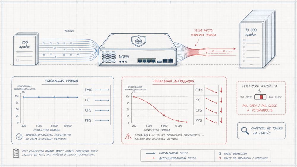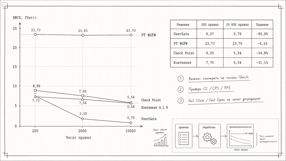 Нюанс обязателен. Абсолютные цифры между разными устройствами нельзя читать как честный бой «лоб в лоб» без поправки на платформы, методики и набор включенных модулей. В отчете смешаны разные версии методик, а железо у части решений заметно разное. Но зависимость внутри одного устройства от роста числа правил все равно очень ценна. Если одна и та же платформа обваливается по мере усложнения политики, от этого факта уже не уйти.