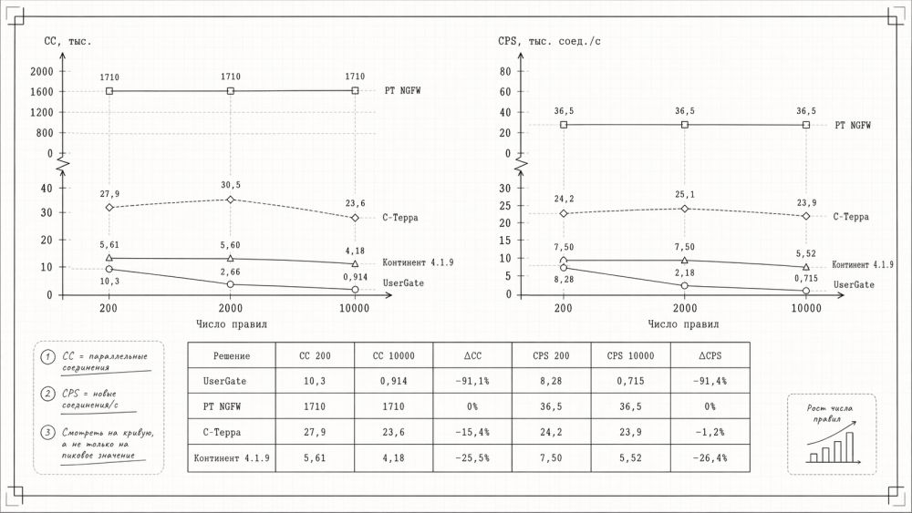 Потому что полоса пропускания может выглядеть терпимо даже там, где уже рушатся новые и параллельные соединения. Для живой корпоративной сети просадка по CC и CPS часто опаснее, чем умеренное падение по Гбит/с. Если устройство теряет способность держать таблицу соединений и быстро открывать новые сессии, пользователи замечают деградацию раньше, чем канал упирается в потолок.