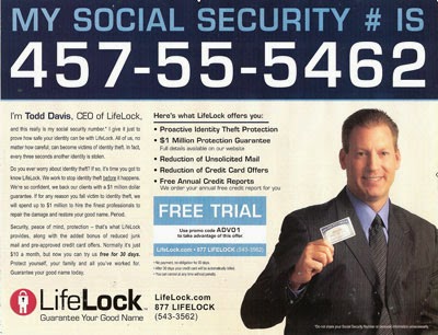 Следующий пример вообще анекдотичен. Генеральный директор компании по ИБ не придумал ничего умнее, чем использовать в рекламной кампании по борьбе с утечками персональных данных... свои собственные ПДн, а точнее номер социального страхования, который и был использован ворами, получившими кредит в 500 долларов по данному SSN.