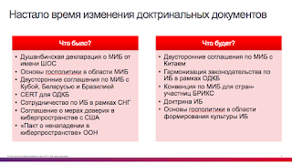 За последнюю неделю стало известно о двух важных событиях, которые могут изменить облик рынка отечественной ИБ в ближайшие годы. Первое событие - это проект новой Доктрины информационной безопасности, о которой написал "Коммерсант" и текст которой уже выложенв Интернет, на одном из белорусских (!) блогов. Я бы сейчас вообще не стал обсуждать этот документ - над ним еще предстоит большая работа, так как ряд вещей там вызывает немалые вопросы, а ряд важных тем вообще не нашла отражения. Поэтому предсказывать конечный результат пока не буду. Но то, что этот документ, после 15-тилетнего затишья может задать новые вектора развития для отечественной отрасли ИБ/ИТ - это точно. Правда, понятны эти вектора будут не раньше следующего года. Все-таки принятие документа запланировано на 2016-й год, а его реализация может начаться не раньше конца 2016-го - начала 2017-го года. Это если все будет развиваться оптимистично и найдутся ресурсы для выполнения всего того, что будет написано в итоговом варианте Доктрины. Но в любом случае это знаковое событие, наряду с принятием в прошлом году основ госполитики в области международной ИБ и начала пересмотра стратегии нацбезопасности, которые зададут тон в том числе и в области ИБ на ближайшие годы.