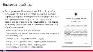 Второй событие произошло 7-го октября, когда премьер-министр Медведев подписалраспоряжение об утверждении Концепции перевода государственных информационных ресурсов, не содержащих сведения, составляющие государственную тайну, в систему федеральных и региональных центров обработки данных (ЦОД). Как написано в документе: "Цель концепции — централизовать инфраструктуру ЦОД и увеличить объем облачных технологий, используемых в информационно-коммуникационной деятельности органов власти. Это позволит более эффективно решать задачи информатизации государственного управления, оптимизировать расходы всех уровней бюджетной системы РФ и повысить устойчивость функционирования и безопасность государственных информационных ресурсов".