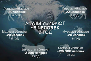 Первая картинка иллюстрирует распространенное заблуждение относительно опасности акул для человека. После фильма "Челюсти" эта тема стала притчей во языцех и акулы рассматриваются как одно из самых опасных животных (рыб). Это ощущения. Реальность другая - статистика говорит, что гораздо опаснее акул коровы, медузы и муравьи. А уж бегемоты и комары - это вообще ходячая/летучая смерть человеческая.