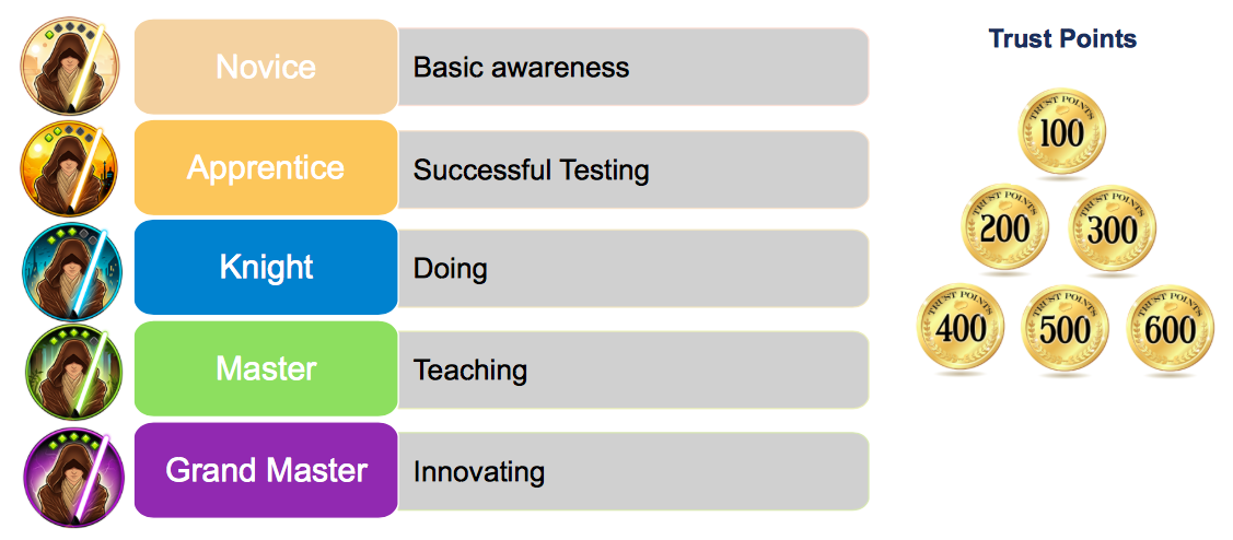 Я уже писал ( вкратце и в деталях) про то, как в Cisco реализована программа Cisco Security Ninja. В SFDC реализована схожая идея - переход в зависимости от числа заработанных баллов от уровня к уровню и получение разнообразных "печенек" - от специальных лого (беджей) на визитках и в подписи к e-mail и заканчивая денежными премиями или подарочными картами.