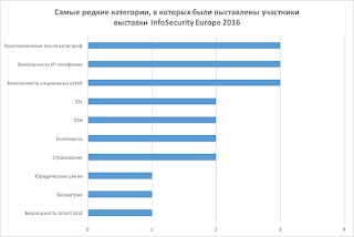 По традиции я проанализировал список участников и составил перечень самых популярных категорий, в которых были выставлены участники InfoSecurity Europe. Как и в случае с RSAC у меня сложилось впечатление, что экспоненты сами указывали категории, в которых они хотели присутствовать. Например, мне не совсем понятно, чем отличаются категории "облачная безопасность" и "SaaS" или "DLP" и "утечки данных" (в оригинале "data breach")? Для меня оказалось неожиданным явный отрыв темы безопасности Wi-Fi. То ли это ошибка составителей каталога выставки, то ли еще какая-то причина. В остальном все более или менее очевидно - никаких сюрпризов я не увидел и от RSA отличий немного. Пожалуй, что явно выделена тема PCI DSS, которая на RSA такого внимания не заслужила.